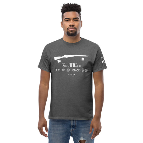 Mosin Nagant rifle cotton T-shirt with vintage ammo can labels dark font